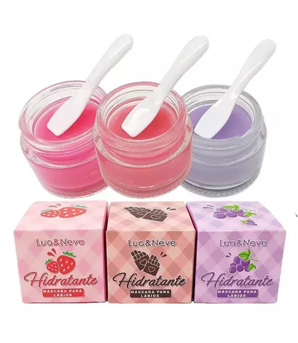 Máscara labial hidratante – Morango / Uva / Chocolate: lábios macios, perfumados e visivelmente saudáveis.